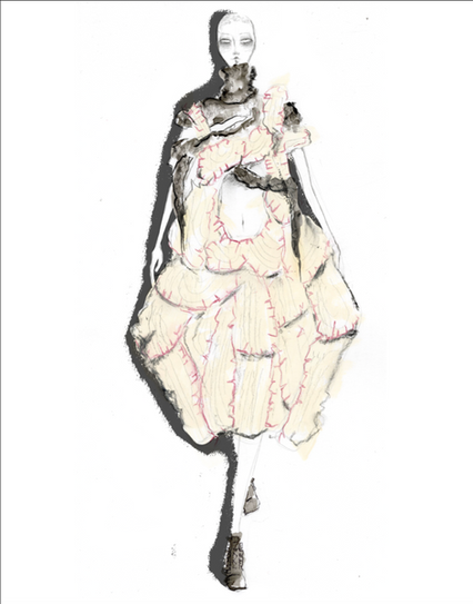 Inspires by the work of Louise Bourgeois, this collection uses hand knits to create unexpected shapes in conjunction with feminine elements.